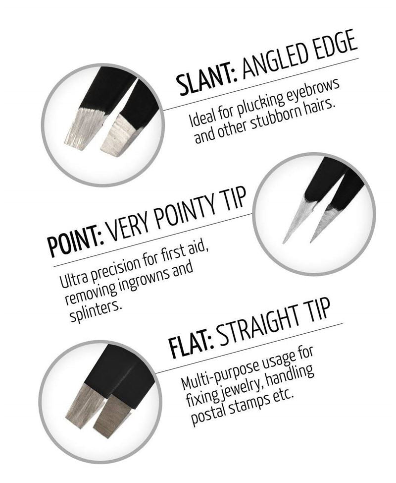 Ein komplettes Pinzettenset mit 3 Pinzetten für alle Bedürfnisse. Das Set beinhaltet eine Präzisionspinzette mit spitzem Ende zum Entfernen eingewachsener Haare oder Splitter. Die beiden breiten Pinzetten mit flachem und abgeschrägtem Ende eignen sich zum Beispiel gut zum Zupfen der Augenbrauen.